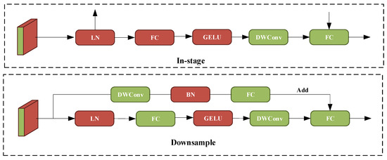 Due to the use of depthwise separable convolution in the convolutional attention module, the amount of computation is largely reduced. The difference between ConvFFN and FFN is that the deep convolution after the activation function can efficiently aggregate local information, allowing for direct downsampling without the need for additional operations. The principle of ConvFFN is shown in Figure 8.