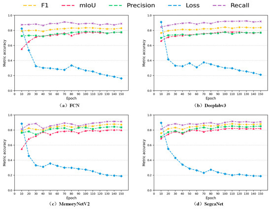 As shown in Figure 9, the curve fluctuations during the iteration process of FCN and MemoryNetV2 are relatively strong, while those of SegcaNet and Deeplabv3 are relatively gentle. As the training proceeds, the total loss gradually decreases, indicating that the network gradually learns the required features. Due to network differences, FCN and MemoryNetV2 exhibit more fluctuations, but, after more than 120 epochs, all networks tend to converge, and the loss approaches the minimum. Among all the compared networks, SegcaNet demonstrates the best performance.