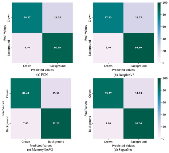 To assess the model’s ability to segment tree crowns of varying densities, several comparative experiments were conducted. Table 1 compares FCN, Deeplabv3, MemoryNetV2, and SegcaNet. The results show that SegcaNet outperforms the other models.
