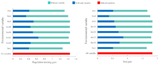 The potential distribution of the shoot blight of larch was mostly influenced by six variables used in the MaxEnt model, which together contributed to 95.2% of the model’s prediction accuracy. The analysis of the contribution of a single factor revealed that the precipitation of the wettest quarter bio16 (25.6%), temperature seasonality bio4 (25.3%), mean annual temperature (14.8%), elevation (12%), annual precipitation (10.8%), and mean temperature of the warmest quarter (6.7%) were the main variables affecting model performance. Precipitation of the warmest quarter (3.4%) and isothermality (1.3%) made a total contribution of 4.7%. The total contribution rate of temperature-dependent factors was 73.7%, while that of precipitation-dependent factors was 14.2%. The jackknife test of the regularized training gain and test gain for variable importance indicated that bio12, bio10, and bio16 were the most important variables (Figure 1).