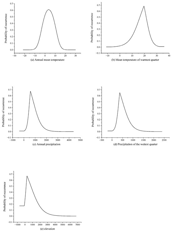 The results demonstrated that mean annual temperature, annual precipitation, precipitation of the wettest quarter, mean temperature of the warmest quarter, and elevation were the main environmental variables affecting the distribution of the shoot blight. By creating marginal response curves, we examined how the predicted probability of species presence could change with each significant factor. This study revealed that the suitable annual mean temperature threshold corresponding to an occurrence probability greater than 0.5 was in the range of 0.5~7.8 °C (Figure 2). The annual mean temperature in the suitable distribution area for shoot blight of larch in Northeast China is −5–11 °C [34], while in the Greater Khingan region, where larch resources are abundant, it is −2–6 °C, which is consistent with the results of this study. Therefore, the regions with a low annual mean temperature in China where shoot blight of larch hosts occurs are more suitable for its distribution, and more attention is given to preventing this disease.
