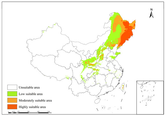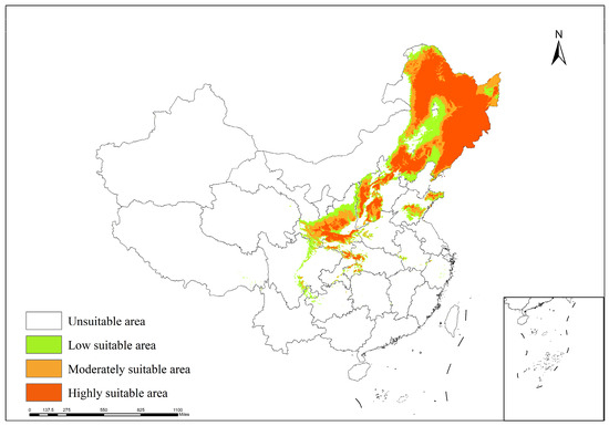 The probability of the output value of each grid cell in the model being between 0 and 1 can reflect the relative suitability. We reclassified the model output with the Jenks natural breaks method: grid cells with suitability values below 0.2 were considered unsuitable regions, and the remaining grid cells were categorized into three groups, in order of low-suitability regions (0.2–0.4), medium-suitability regions (0.4–0.6), and high-suitability regions (0.6–1.0). ArcGIS software was used to calculate the proportion of potentially suitable areas (PSAs) and create visualizing distribution maps of the final results [33].