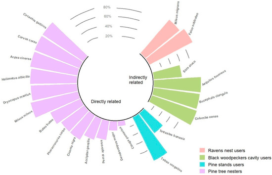 The work detailed here was carried out in the years 2001–2023. An assessment of the level of dependence of different bird species in the Augustów Forest on the presence of the SP was done by reference to percentage shares regarding nests and broods on, in, or among SP. The study included birds of prey, woodpeckers, owl species, forest grouse, the common raven Corvus corax, and other selected non-Passeriformes birds. Only species for which there are representative data on at least 40% of breeding places of the entire area’s population were considered.
