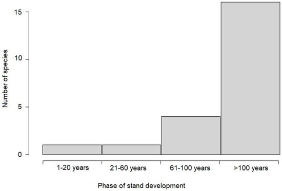The particular species of bird associated with the SP used different developmental stages of stands. The largest species group (e.g., the Western Capercaillie, birds of prey, the Common Raven, the Black Woodpecker, and large secondary cavity-nesters) depended on old growth stages. The number of species associated with the SP increases with the age of the trees (Figure 2). This tree species reaches critical importance in older developmental stages and age classes.
