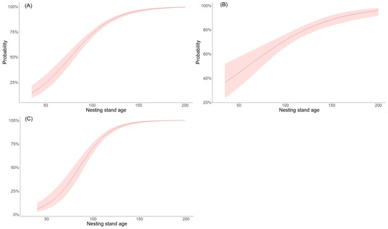 The probability of choosing the SP by bird species for creating a breeding place increases along with the age of trees. The relationship is significant for all species strongly specialised for the SP, as well as for separately analysed nest sites of birds building large arboreal nests and birds nesting in cavities (Figure 3A–C, Table 3).
