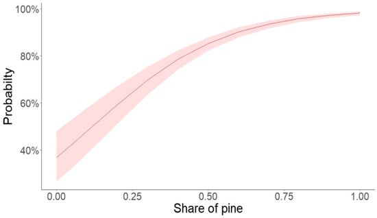 Figure 4. The probability of using the Scots pine as a nesting tree depending on the proportion of this tree species in the stand (Intercept = −0.54, SE = 0.24, z = −2.27, p = 0.023; Scots pine share = 4.60, SE = 0.41, z = 11.27, p < 0.001).