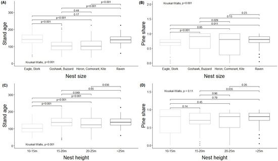 Figure 5. The Kruskal–Wallis results for the dependency between the stand age and groups of nest size (A) and nest height (C) and the Scots pine share with groups of nest size (B) and nest height (D). Pairwise comparisons were calculated by using the Dunn test with Bonferroni correction.