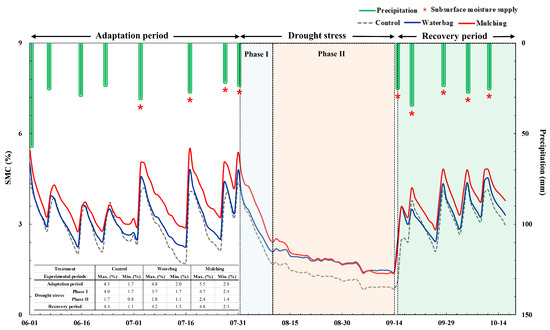 Figure 2 shows the changes in soil moisture content on an indoor artificial rainfall-modeled slope according to different vegetation-based treatments. Throughout the time of the periodic rainfall treatment, mulching treatment resulted in a greater immediate increase in soil moisture due to rainfall compared to other treatments, and the decrease afterward was not significant, resulting in a higher overall soil moisture content. In the case of the waterbag treatment, the initial increase in soil moisture content due to rainfall was similar to the control group, but the decrease afterward was more gradual compared to the control. This trend continued during the drought stress experiment, with a similar pattern observed in the initial decrease in soil moisture. After the rainfall treatment on July 31 (DS0), the order of higher soil moisture content was mulching treatment > waterbag treatment = control, followed by a rapid decrease in soil moisture content in all treatments until August 11 (DS11) (phase I). During phase I, soil moisture content decreased by 39.9%, 43.3%, and 47.0% for the control, waterbag treatment, and mulching treatment, respectively, compared to DS0. At DS11, the order of higher soil moisture content was mulching treatment > waterbag treatment > control, with the waterbag showing a relatively gradual decrease compared to the other treatments. From August 12 (DS12) to September 14 (DS45), the decrease in soil moisture content was much more gradual in all treatments compared to phase I (phase II). Particularly after August 16 (DS16), the soil moisture content was in the order of mulching treatment = waterbag treatment > control (Figure 2).
