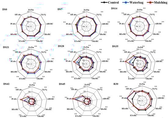 At DS28, mulching treatment’s PIabs and SFIabs were 67.7% and 31.3% higher, respectively, than the control, while the waterbag treatment was at intermediate levels between mulching treatment and the control, with 25.1% and 13.7% higher levels than the control, respectively. Under extreme drought stress at DS45, mulching treatment’s ABS/RC and DIo/RC were 62.1% and 37.4% lower, respectively, than the control, while PIabs and SFIabs were 4.5 times and 2.2 times higher, respectively. After the 30-day recovery period with re-watering, the waterbag and mulching treatments showed similar levels, but compared to the control, other treatments maintained higher ABS/RC, DIo/RC, TRo/RC, and ETo/RC levels, while PIabs and SFIabs were only 45% and 75% of those in mulching and the waterbag treatments, respectively.