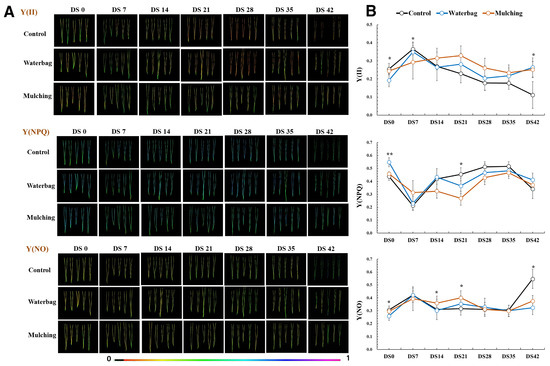 The effective quantum yield Y(II), which expresses the results of all functional cooperation, significantly influences crop productivity under drought stress by affecting the net photosynthesis rate and Y(II) performance [21,22]. A gradual decrease in Y(II) was observed in the control from DS7 onwards, whereas mulching treatment showed higher trends from DS14 and waterbag treatment from DS21, indicating that higher yields were maintained under long-term drought stress.