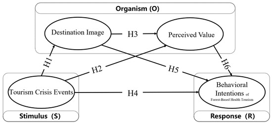The Stimulus–Organism–Response (SOR) theory suggests that external stimuli can trigger changes in individuals’ cognition and emotions, leading to approach or avoidance behaviors [35]. Hence, it can be utilized to investigate the impact of external stimuli on individuals’ cognitive and emotional responses and further predict corresponding behaviors [36]. Liang et al. (2024) applied the SOR theory to reveal that live streaming in tourism (S) positively affects viewers’ flow experience and trust (O), ultimately promoting impulsive travel intentions (R) [37]. Wang & Lan (2021) employed the SOR theory to identify how consumers’ perception of COVID-19’s severity (S) triggers nostalgia (O), leading to an increased desire for leisure travel (R) [38]. The SOR theory is widely used in tourism literature to study visitor behavior [36,37,38,39]. Therefore, this study builds on the foundation of SOR theory. Our model considers tourism crisis events as antecedent variables that influence older adults’ intentions for forest-based health tourism. These events primarily act as external stimuli (S) and affect their images and perceived value (O) of destinations, which ultimately lead to behavioral intentions for forest-based health tourism (R).