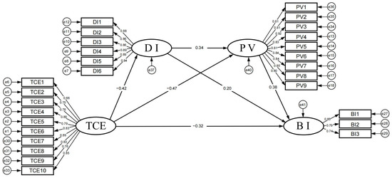 Hypothesis 1 suggests a negative relationship between tourism crisis events and destination image (coefficient = −0.415, p < 0.01). Similarly, Hypothesis 2 suggests a negative relationship between tourism crisis events and perceived value (coefficient = −0.47, p < 0.01). Meanwhile, Hypothesis 3 suggests a positive relationship between destination image and perceived value (coefficient = 0.337, p < 0.01). Hypothesis 4 suggests a negative relationship between tourism crisis events and behavioral intention (coefficient = −0.324, p < 0.01). Furthermore, Hypothesis 5 suggests a positive relationship between destination image and behavioral intention (coefficient = 0.202, p < 0.01). Additionally, Hypothesis 6 suggests a positive relationship between perceived value and behavioral intention (coefficient = 0.381, p < 0.01) (see Table 6 and Figure 2).