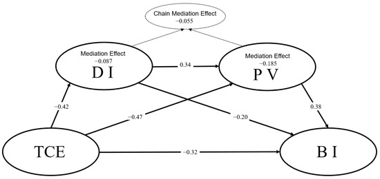 To verify the significance threshold of indirect effects, the researchers analyzed the data in this study. This study continued to use the free bootstrapping method (with 2000 bootstrapping samples recovered from 408 samples) under the assumption of a multivariate normal distribution. The researchers tested the significance of indirect effects in the final path model at the 95% confidence interval level. Table 7 indicates that the total effect found in this study is c = −0.662, which is significant (p < 0.05). According to Table 7, the indirect effect of (tourism crisis events→destination image→behavioral intention) is −0.087, which is significant (p < 0.05), indicating significant indirect effects. Thus, the mediating effect is significant and partial. The analysis verifies the mediating role of destination image in the relationship between tourism crisis events and forest-based health tourism behavioral intentions. The indirect effect of (tourism crisis events→perceived value→behavioral intention) is −0.185, which is significant (p < 0.05), indicating significant indirect effects. Thus, the mediating effect is significant and partial. The results validate the mediating role of perceived value in the relationship between tourism crisis events and forest-based health tourism behavioral intentions. The indirect effect of (tourism crisis events→destination image→perceived value→behavioral intention) is −0.055, which is significant (p < 0.05), indicating significant indirect effects. Thus, tourism crisis events affect forest-based health behavioral intention by influencing destination image and then perceived value. This verifies the establishment of H7. The results of mediation effects are shown in Figure 3.