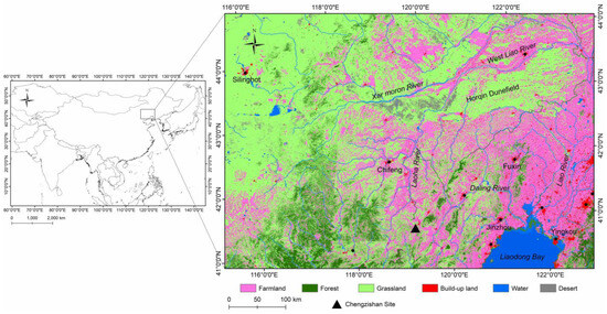 - Li, Y.Y.; Willis, K.J.; Zhou, L.P.; Cui, H.T. The impact of ancient civilization on the northeastern Chinese landscape: Palaeoecological evidence from the Western Liaohe River Basin, Inner Mongolia. Holocene 2006, 16, 1109–1121. [Google Scholar] [CrossRef]