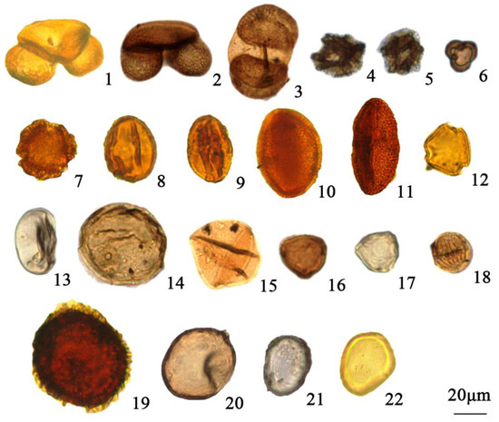 Main pollen and spore types at the Chengzishan site. (1–3: Pinus; 4–5: Taraxacum; 6: Artemisia; 7: Aster; 8–9: Quercus; 10–11: Polygonaceae (11: Fagopyrum); 12: Rhamnaceae; 13–15: Poaceae; 16–17: Corylus; 18: Polygalaceae; 19: Malvaceae; 20: Glomus; and 21–22: Concentricystis).