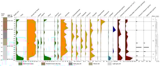 The biome reconstruction at the base of the profile (Zone I, 200–185 cm) reveals that the vegetation at the study site was predominantly characterized by temperate coniferous and broadleaved mixed forest. High values of the AP/NAP ratio further suggest a relatively high vegetation density during this period [47]. The limited presence of millet seeds indicates a relatively low level of agricultural activity that has not yet exerted a significant impact on the original vegetation.