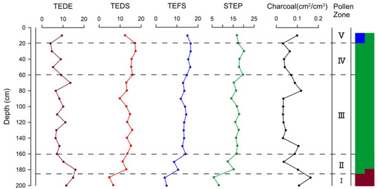 In Zone V (20–0 cm), the increase in Pinus suggests the recovery of the original vegetation after cultivation abandonment. TEDS and TEFS exhibited significant increases in Zones IV and V, while charcoal concentration maintained a low level, possibly attributed to cultivation abandonment in response to soil fertility loss. Concurrently, pioneer tree species such as Pinus and Betula with strong competitive abilities began to occupy the bare ground; however, in general, the vegetation structure did not undergo significant changes, and STEP remained the dominant vegetation type.