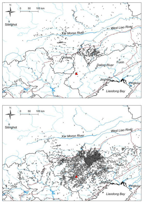Distribution of archaeological sites of different cultures in western Liaoning. (Upper: Hongshan Culture and Xiaoheyan Culture, 7000–4000 BP; Below: Lower Xiajiadian Culture, 4000–3500 BP. Red triangles indicate the location of Chengzishan site. The spatiotemporal data for agricultural sites are from [53]).