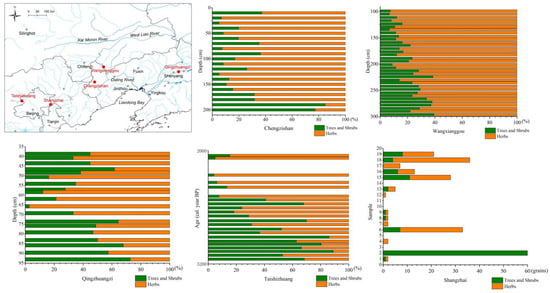 The pollen analysis of the Chengzishan profile is compared with studies of archaeological sites in the surrounding areas, such as Taishizhuang, Shangzhai, Qingzhuangzi, and Wangxianggou, in the temperate region of the middle and late Holocene [41,42,43,44]. The Wangxianggou site profile is located at the foot of the southern loess hill near a tributary of the Laoha River in western Liaoning [41]. We compared the tree-shrub and herb ratios of profiles from Chengzishan and Wangxianggou sites (Figure 6). It can be obviously noted that, as a result of anthropogenic activities in the cultural layer, trees and shrubs have gradually decreased while herbs have increased, reflecting the fact that anthropogenic activities have reduced the forest component of the original vegetation and that the openness of the vegetation has gradually increased (Figure 6). And this finding is universal among the sites of this period. In the upper section of the Wangxianggou Site, the pollen content of Humulus and Fagopyrum, indicating human activities, increased. Shangzhai, Taishizhuang, and Qingzhuangzi also indicate that under the influence of human activities (probably agricultural practices), Poaceae increased significantly and occupied a certain proportion in the pollen assemblage. Based on comparisons with the archaeological sites in the region, it is reasonable to believe that agriculture was the main mode of human activity during this period at the Chengzishan site [41,42,43,44]. Similarly, agricultural practices in Zone II and Zone III of the Chengzishan site and the utilization of hazel led to a high proportion of Poaceae and Corylus and an increase in Humulus and other weeds associated with farmland. Therefore, we suggest that Poaceae, Humulus, and Corylus could be used as potential PFTs for the anthropogenic biome in the study area.