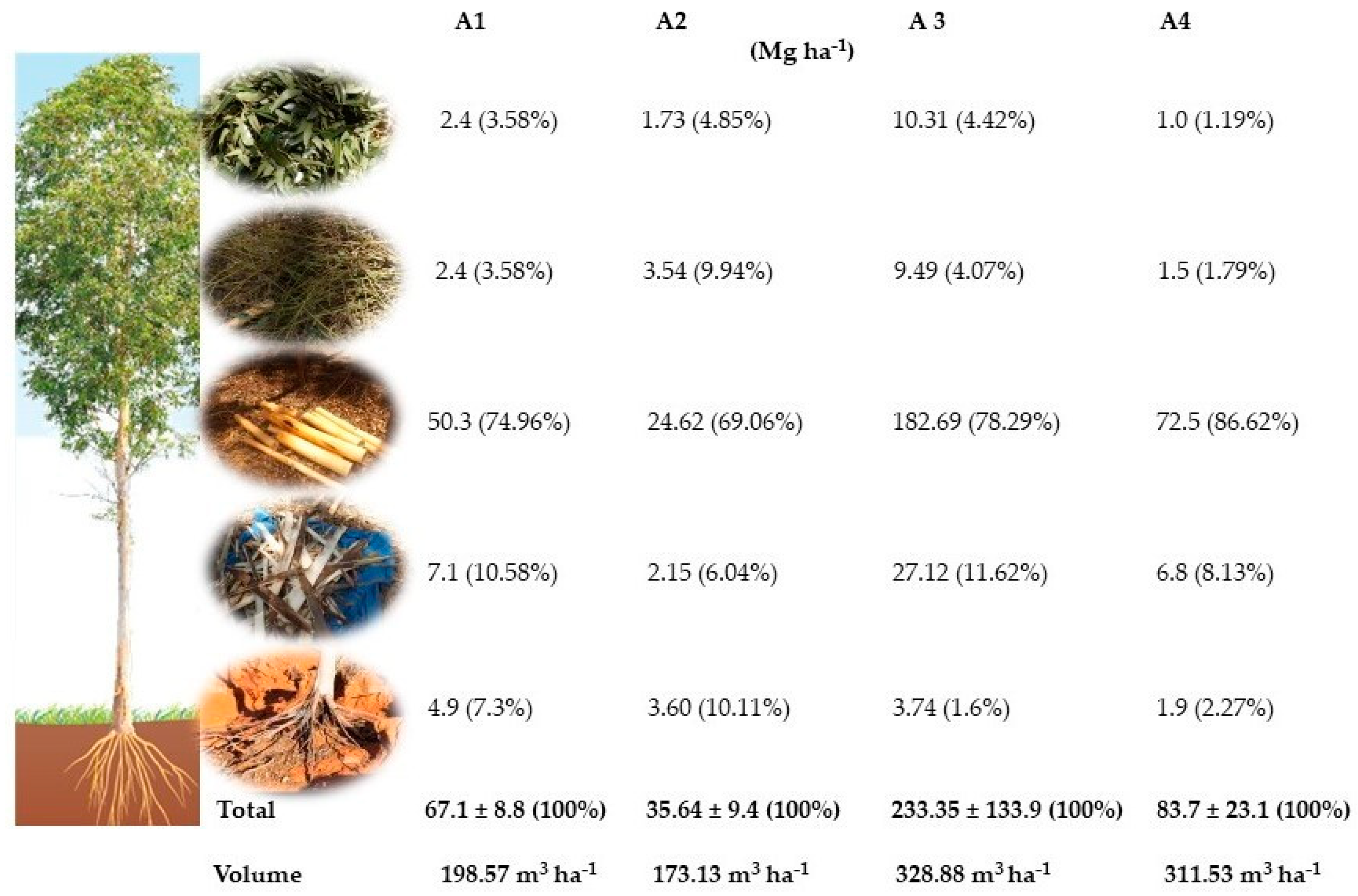 - Viera, M.; Rodríguez-Soalleiro, R. A Complete Assessment of Carbon Stocks in Above and Belowground Biomass Components of a Hybrid Eucalyptus Plantation in Southern Brazil. Forests 2019, 10, 536. [Google Scholar] [CrossRef]