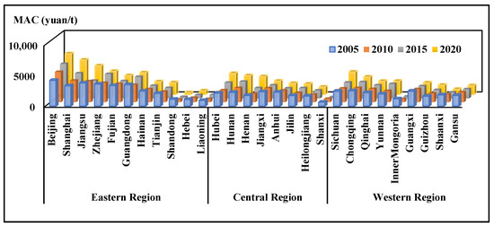 The MAC is higher in Beijing, Zhejiang, Shanghai, Jiangsu, and Guangdong, where the provinces/cities are developed more economically and the economic cost per unit of non-consensual output reduction is greater. The highest MAC in Beijing and Shanghai is due to their low industrial share and high economic capacity. Therefore, they have effectively improved pollution control and abatement facilities, resulting in less room for carbon abatement and greater difficulty in reducing carbon emissions. Liaoning launched a low-carbon-emission pilot in July 2010, and with the innovation of emission reduction technology and the initial investment of funds, the cost of emission reduction in Liaoning has been reduced effectively. In the central region, Hubei province has a higher MAC because its energy structure is dominated by coal, which makes it more difficult to reduce emissions. Western regions such as Guizhou, Xinjiang, Shaanxi, and Ningxia are less economically developed and thus have a lower economic cost per unit of non-consensual output reduction. In addition, western regions such as Guizhou and Yunnan, where agriculture and tourism are better integrated, produce low economic output relative to traditional agriculture, and thus, the economic cost of reducing one unit of carbon emissions is lower.