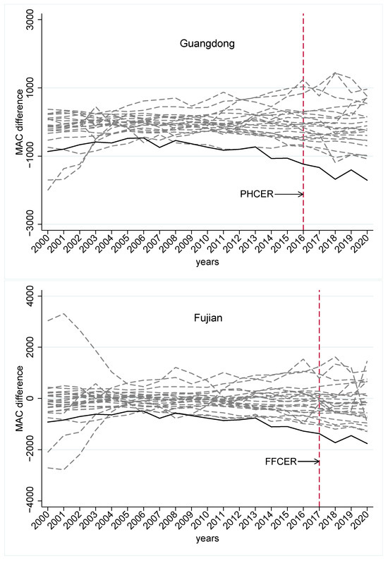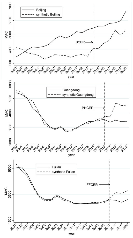For the implementation of the forestry carbon offset policy, “synthetic Beijing” was fitted using control variables from 2000 to 2013, “synthetic Guangdong” from 2000 to 2015, and “synthetic Fujian” from 2000 to 2016. The synthetic Beijing is weighted by Shanghai (0.874), Zhejiang (0.073), and Sichuan (0.053); the synthetic Guangdong is weighted by Zhejiang (0.862) and Jiangxi (0.138); the synthetic Fujian is weighted by Shanghai (0.039), Jiangsu (0.532), Zhejiang (0.1), Hainan (0.145), Chongqing (0.074) and Qinghai (0.11). In Figure 2, the solid line indicates the MAC of the experimental group; the dashed line indicates the MAC of the synthetic control group, and the vertical dashed line indicates the year when the forestry carbon offset policy was implemented.