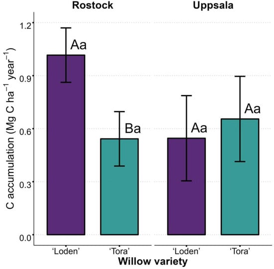 Soil C accumulation: estimated marginal means of topsoil (0–10 cm depth) C accumulation rates for the Salix varieties ‘Loden’ and ‘Tora’ grown in monoculture at sites Rostock and Uppsala. Site-specific bulk densities 1.3 and 1.4 g cm3 used in calculations of C stocks in Rostock and Uppsala, respectively. Different uppercase letters indicate significant pairwise differences between willow varieties within each site (A–B; p < 0.05). Different lowercase letters indicate significant pairwise differences for each willow variety between sites (a–b; p < 0.05). Standard errors are shown as error bars.