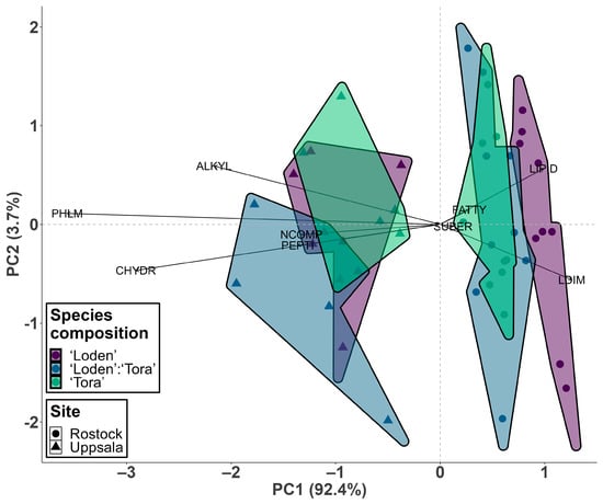 SOM chemical composition: principal components plot of the relative ion intensities (% TII) of nine compound classes; CHYDR, PHLM, LDIM, LIPID, ALKYL, NCOMP, PEPTI, SUBER, FATTY in Py-FI mass spectra (for abbreviations, see Table 2) in topsoil (0–10 cm depth) for the Salix varieties ‘Loden’ and ‘Tora’ grown in monoculture and mixture at sites Rostock and Uppsala.
