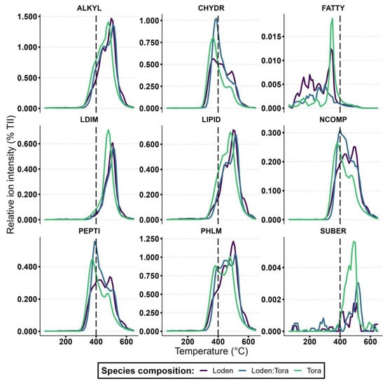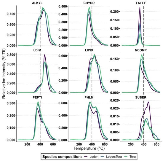 SOM thermal stability: thermograms showing ions volatilized under pyrolysis (0–650 °C) of nine compound classes; CHYDR, PHLM, LDIM, LIPID, ALKYL, NCOMP, PEPTI, SUBER, FATTY in Py-FI mass spectra (for abbreviations, see Table 2) in topsoil (0–10 cm depth) for the Salix varieties ‘Loden’ and ‘Tora’ grown in monoculture and mixture at the Rostock site. Higher values of relative ion intensity indicate a greater abundance of specific compounds in the pyrolyzed SOM. The temperature at which compounds volatilize reflects their thermal stability, with ions volatilized over 400 °C being regarded as stable and ions volatilized under 400 °C being regarded as labile.