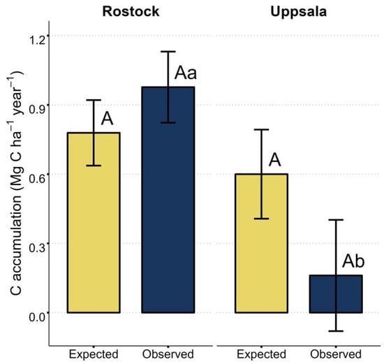Soil C accumulation: estimated marginal means of expected and observed topsoil (0–10 cm depth) C accumulation rates at sites Rostock and Uppsala. Site-specific bulk densities 1.3 and 1.4 g cm3 used in calculations of C stocks in Rostock and Uppsala, respectively. Expected values represent the basal area weighted and averaged mean values of the Salix varieties ‘Loden’ and ‘Tora’ grown in monoculture and observed values represent the mean values of ‘Loden’ and ‘Tora’ grown in mixture. Different uppercase letters indicate significant pairwise differences between expected and observed mixture values within each site (A–B; p < 0.05). Different lowercase letters indicate significant pairwise differences for observed mixture values between sites (a–b; p < 0.05). Standard errors are shown as error bars.