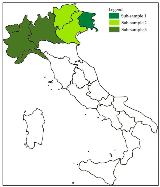 The research endeavor sought to explore the attitudes towards FB among inhabitants residing within the northern regions of Italy. It was deemed appropriate to consider the residents living in the study area as actual or potential tourists. This made it possible not to limit the analysis to a defined category, such as the tourists’ category, which already belongs to a subset of the population but excludes potential tourists. Particular attention was directed towards residents inhabiting three distinct macro areas: Lombardy, Piedmont, Aosta Valley, and Liguria as the northwest Italy area; Veneto, Autonomous Province Trento, and Autonomous Province Bolzano as the northeast Italy area; and the Friuli Venezia Giulia region. The northeast area of Italy is the main study area of the project iNEST within the “Spoke 1” denominated “Ecosystems for Mountain Innovation” (Figure 2).