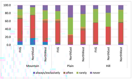 Data were analyzed considering the three subsamples. The subsamples (northwest regions, northeast regions, and FVG region) are described processing from the specific (the FVG subsample) to the more general subsamples represented by the northeast and northwest regions. Among the samples, 65.2% from the FVG, 76.0% from the northeast, and 61.5% from the northwest declared to visit forests with a higher preference toward mountain forests (Figure 3).