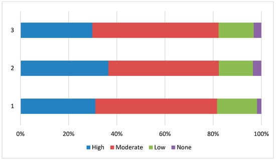 The educational level was relatively high, with 53.9% holding a high school diploma, 29.9% holding a bachelor’s degree, and 6.8% having a higher educational level (master’s and PhD). The largest employment category was employees (37.5%), followed by workers (17.1%) and freelancers (11.7%). The main employment sectors were “Other services to people and the third sector” (42.5%), “Public administration” (19.7% each), and “Trade, transport, telecommunication, credit, and business services” (19.2%). Regarding income, 72.7% of respondents had a net individual income below EUR 45,000 (17.5% up to EUR 15,000, 38.5% from EUR 15,001 to 30,000, and 16.7% from EUR 30,001 to 45,000).