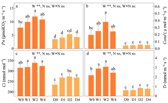 The effect of different nitrogen concentrations on gas exchange in T. sinensis under water and drought conditions. Pn, photosynthetic rate (a); Cond, stomatal conductance (b); Ci, intercellular CO2 concentration (c); and Tr, transpiration rate (d) under drought and water treatments with no N fertilization, 0.70 mol N, 0.14 mol N, or 0.28 mol N·plant−1. Different letters on the bars indicate significant differences in each index among eight treatments via the Duncan test (p < 0.05). p values obtained from the two-way ANOVAs for water treatments (W), nitrogen treatments (N), and their interactions (N × W) are indicated. ** p < 0.01; ns, not significant.