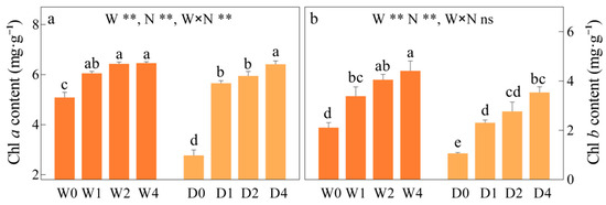 The effect of different N concentrations on chlorophyll content in T. sinensis under water and drought conditions. Chl a, chlorophyll a contents (a) and Chl b, chlorophyll b contents (b) under drought and water treatments with no N fertilization, 0.70 mol N, 0.14 mol N, or 0.28 mol N·plant−1. Different letters on the bars indicate significant differences in each index among eight treatments by the Duncan test (p < 0.05). p values obtained from the two-way ANOVAs for water treatments (W), N treatments (N), and their interactions (N × W) are indicated. ** p < 0.01; ns, not significant.