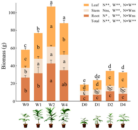 The effect of different N concentrations on biomass in T. sinensis under water and drought conditions. Total biomass, root biomass, stem biomass, and leaf biomass under drought and water treatments with no N fertilization, 0.70 mol N, 0.14 mol N, or 0.28 mol N·plant−1. * p < 0.05, the same applies below. Different letters on the bars indicate significant differences in each index among eight treatments via the Duncan test (p < 0.05). p values obtained from the two-way ANOVAs for water treatments (W), N treatments (N), and their interactions (N × W) are indicated. ** p < 0.01; * 0.01 < p < 0.5, ns, not significant.