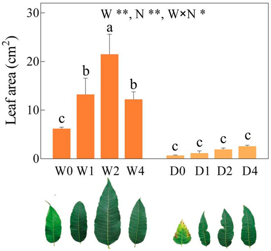 The effect of different N concentrations on biomass in T. sinensis under water and drought conditions. Leaf area under drought and water treatments with no N fertilization, 0.70 mol N, 0.14 mol N, or 0.28 mol N·plant−1. Different letters on the bars indicate significant differences in each index among eight treatments via the Duncan test (p < 0.05). p values obtained from the two-way ANOVAs for water treatments (W), N treatments (N), and their interactions (N × W) are indicated. ** p < 0.01; * 0.01 < p < 0.5.