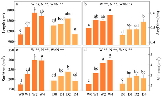 The effect of different N concentrations on root morphology in T. sinensis under water and drought conditions. Length, total root length (a); AvgDiam, root average diameter (b); SurfArea, root surface area (c); and Volume, root volume (d) under drought and water treatments with no N fertilization, 0.70 mol N, 0.14 mol N, or 0.28 mol N·plant−1. Different letters on the bars indicate significant differences in each index among eight treatments via the Duncan test (p < 0.05). p values obtained from the two-way ANOVAs for water treatments (W), N treatments (N), and their interactions (N × W) are indicated. ** p < 0.01; ns, not significant.