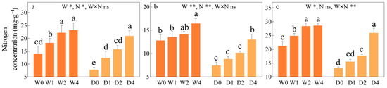 The effect of different N concentrations on N concentrations in T. sinensis under water and drought conditions. Root N concentration (a), stem N concentration (b), and leaf N concentration (c) under drought and water treatments with no N fertilization, 0.70 mol N, 0.14 mol N, or 0.28 mol N·plant−1. Different letters on the bars indicate significant differences in each index among eight treatments via the Duncan test (p < 0.05). p values obtained from the two-way ANOVAs for water treatments (W), N treatments (N), and their interactions (N × W) are indicated. ** p < 0.01; * 0.01 < p < 0.5, ns, not significant.