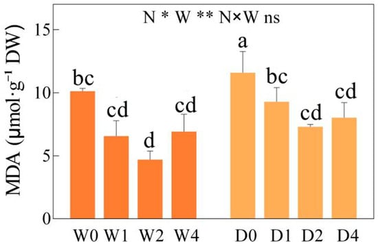 The effect of different N concentrations on MDA in T. sinensis under water and drought conditions. MDA, malondialdehyde content under drought and water treatments with no N fertilization, 0.70 mol N, 0.14 mol N, or 0.28 mol N·plant−1. Different letters on the bars indicate significant differences in each index among eight treatments via the Duncan test (p < 0.05). p values obtained from the two-way ANOVAs for water treatments (W), N treatments (N), and their interactions (N × W) are indicated. ** p < 0.01; * 0.01 < p < 0.5, ns, not significant.