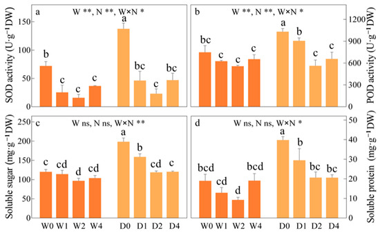 The effect of different N concentrations on antioxidant physiological characteristics in T. sinensis under water and drought conditions. SOD activity, superoxide dismutase enzyme activity (a); POD activity, peroxidase enzyme activity (b); soluble sugar, soluble sugar content (c); Pro, protein content (d). under drought and water treatments with no N fertilization, 0.70 mol N, 0.14 mol N, or 0.28 mol N·plant−1. Different letters on the bars indicate significant differences in each index among eight treatments via the Duncan test (p < 0.05). p values obtained from the two-way ANOVAs for water treatments (W), N treatments (N), and their interactions (N × W) are indicated. ** p < 0.01; * 0.01 < p < 0.5, ns, not significant.