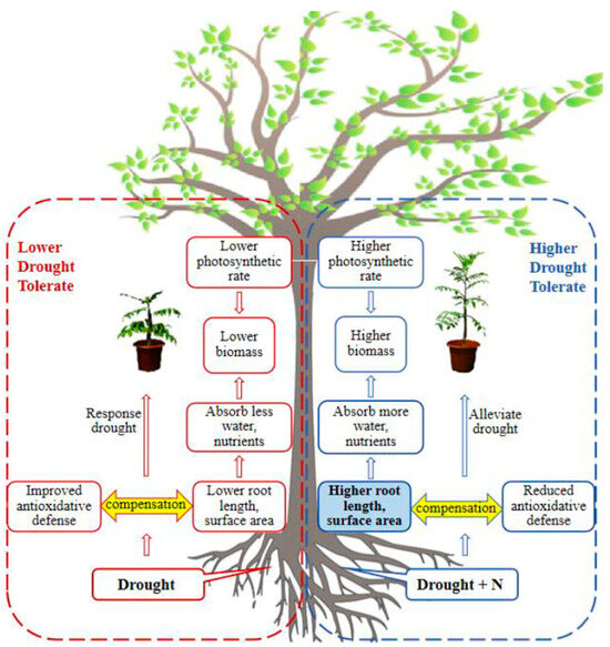 In China, arid and semi-arid areas are predominantly located in the north, where soil N concentration in North China (except in Northeast China) is less than 1.0 g·kg−1, lower than the national average level (2.9 g·kg−1). This combination of drought and N deficiency constitutes a major constraint on forest growth and productivity [11]. Nitrogen (N) plays a crucial role in plant drought resistance, and applying an appropriate amount of N fertilizer can alleviate plant drought stress through the following: promoting plant stomatal closure, reducing water transpiration, and decreasing the rate of water loss, thereby alleviating plant water stress [12]. Additionally, N enhances the activity of the antioxidant system, enhances the resistance to oxidative stress caused by drought, and reduces cell damage. N can also help in osmotic regulation, maintaining cellular water balance and thereby enhancing the plant’s drought tolerance [13]. However, excessive application of N fertilizer can inhibit the root zone’s elongation, suppress water absorption, increase the plant’s sensitivity to drought, and aggravate the damage of drought stress to plant growth [14,15]. Therefore, optimizing plant growth and drought adaptation through judicious N management is crucial for determining appropriate application rates [16].