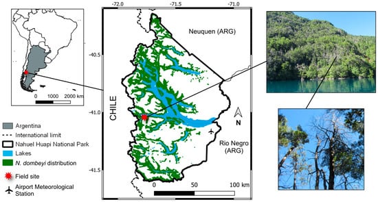 Map showing N. dombeyi distribution (green) in Nahuel Huapi National Park, northern Patagonia (Argentina), and the location of the field sampling site (red star). Coordinates on the axes are given in the World Geodetic System (WGS 84). To the right, illustrative views of the site in 2019 (top photograph), and trees that died in 2015 (bottom photograph).
