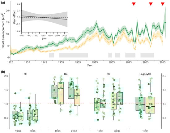 (a) Inter-annual variation of basal area increment (BAI) of vital (solid green lines) and dead (dashed orange lines). Solid lines represent the means and shaded areas around them the standard error of the mean. The grey rectangles indicate the periods when BAI significantly (p < 0.05) differed between vigour classes (Wilcoxon rank-sum tests). Downward triangles in red represent the main drought years during the last decades (1998, 2008 and 2015). The plot inset in figure represents predicted smooth differences in the effect of calendar year on growth trends according to GAMMs. (b) Resistance (Rt), recovery (Rc), resilience (Rs) and Legacy98 (pre/post 10 years) against the driest spells (1998 and 2008). The mingling index (M) was used as colour scale (0 = light green to 1 = dark green) for individual resilience components.