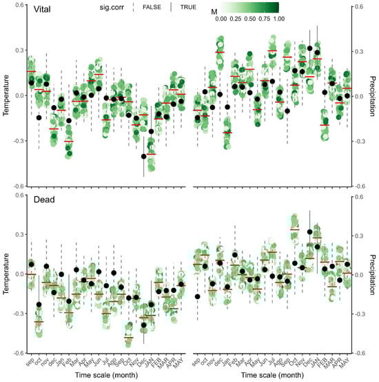 Pearson correlation coefficients using detrended prewhitened individual tree ring index (coloured jitter points with mean (red line)) and group residual chronology (black point range) with mean monthly temperature and total monthly precipitation for vital (top) and dead (bottom) N. dombeyi trees. Solid black point range depicts significant correlation according to bootstrap. The mingling index (M) was used as colour scale (0 = light green to 1 = dark green) for individual climate–growth tree coefficients.