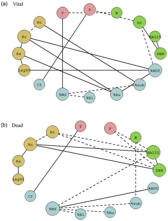 We evaluated the covariations between all the considered variables and their effect on the health status of each N. dombeyi tree by correlational network analysis, which is flexible, allows for the untargeted exploration of the data without prior known relationships, and accommodates many data types []. We linked all the tree and neighbourhood variables by tree vitality status, using a set of variables grouped in four classes: tree characteristics (BAI25, DBH, height (ht), and crown spread (W)); climate–growth relationship (with temperature (T) and precipitation (P)); drought–growth performance (Rt, Rc, Rs, and legacy98), and neighbourhood pressure (CI, % N. dombeyi (%Nd), % A. chilensis (%Au), % broadleaf codominant species (%Bl), % subdominant species (%sub), and proportion of dead N. dombeyi following 2014–15 drought (%NDT)). We decided not to include mingling (M), as we characterized mingling values with the proportion of species in the neighbourhood.