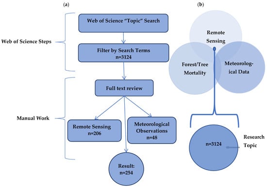 For our analysis, we used the Web of Science digital database, including the Science Citation Index (SCI) (last accessed on 16 October 2023). A systematic review assesses the progress of tree/forest mortality research papers globally based on remote sensing and meteorological ground-based ones. Figure 1a illustrates the workflow adopted, resulting in n = 254 peer-reviewed publications (the list of References does not cover all the papers used in the current analysis; instead, the complete list is given in Supplementary Materials S1). Remote sensing and meteorological ground-based studies are depicted as overlapping circles in Figure 1b. We incorporate the all-possible synonymous terms with tree mortality by combining various groups of terms related to “remote sensing” and “meteorology”.