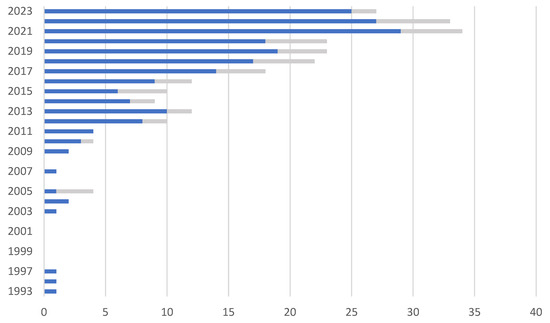 Tree mortality papers appear to have increased over the years (Figure 2). The first pioneer study on tree mortality monitoring related to frequent drought events appeared for patches of California Cuyamaca State Park in 1993 [30]. A few peer-reviewed articles appear until 2009, with data gaps in 1998–2002, 2006, and 2008. Figure 2 depicts an increasing trend, starting from 2010, in the number of published research articles, which will peak in 2021.