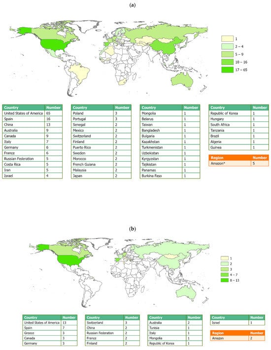 Global spatial distribution of tree mortality publications applying remote sensing (a) or using meteorological ground-based indicators (b). The color shades indicate the frequency of research publications per investigated country (* French Guiana shown separately from Amazon).
