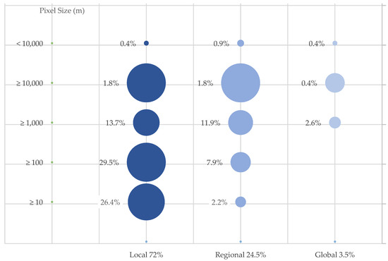The extent of study areas versus spatial resolution for publications utilizing remote sensing. The shades of blue are proportional to the scale (Local scale = dark blue, Regional scale = medium blue, Global scale = light blue).